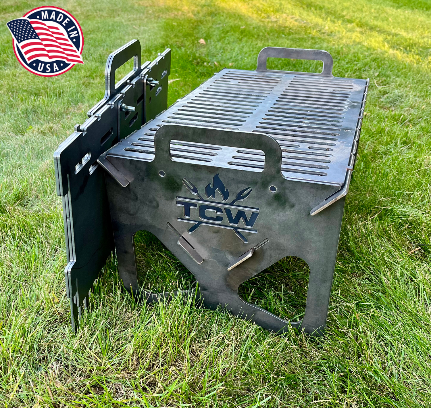 TCW Collapsible Grill – Durable. Portable. Built for serious outdoor cooking, the TCW Collapsible Grill is a premium-quality, portable BBQ grill crafted for maximum convenience and performance. Made from rugged 10-gauge mild steel, this grill is tough enough to handle high heat and heavy use, while still being easy to transport and store. Assemble or disassemble it in under a minute — no tools required. Whether you're at the campsite, tailgating, or grilling in the backyard, this grill is ready to go when you are. Proudly made in the USA with American materials and craftsmanship.